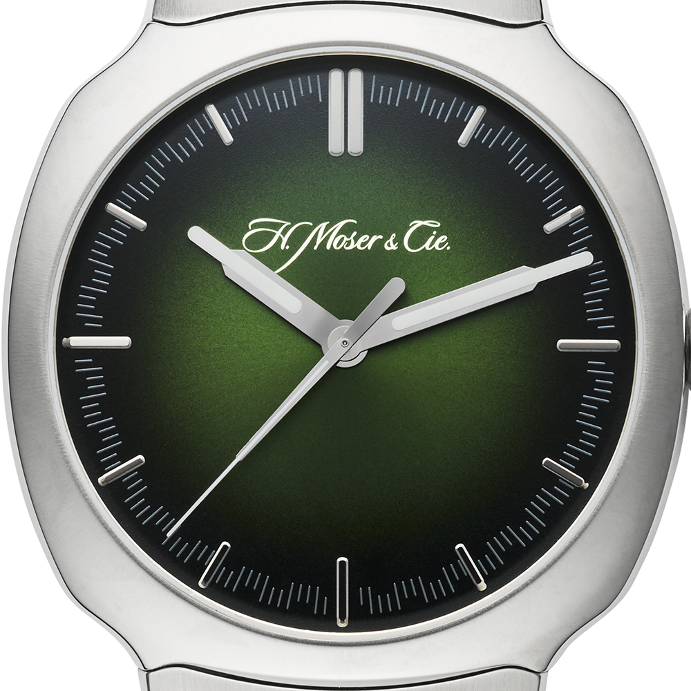 ケースとブレスレット一体化したストリームライナー コレクション。このモデルのために新たに開発されたマトリックスグリーン フュメダイアルは光の当たり方により、イエロー、グリーン、ゴールドをミックスしたかのような色調の変化を楽しむことができます。