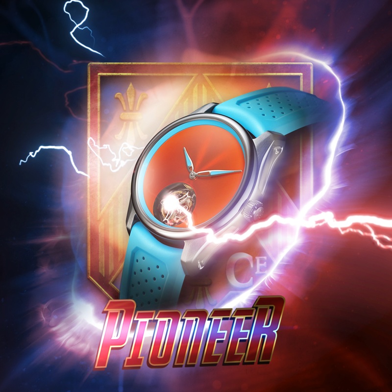 機能・特徴 | スーパールミノヴァ® を塗布したターコイズブルーのフランジ、リーフ型の時分針 ミニッツフライングトゥールビヨン オリジナルのダブルヘアスプリング ラチェット式両方向自動巻きシステム 18K レッドゴールド製スケルトン ローター ターコイズブルーラバーストラップ |
